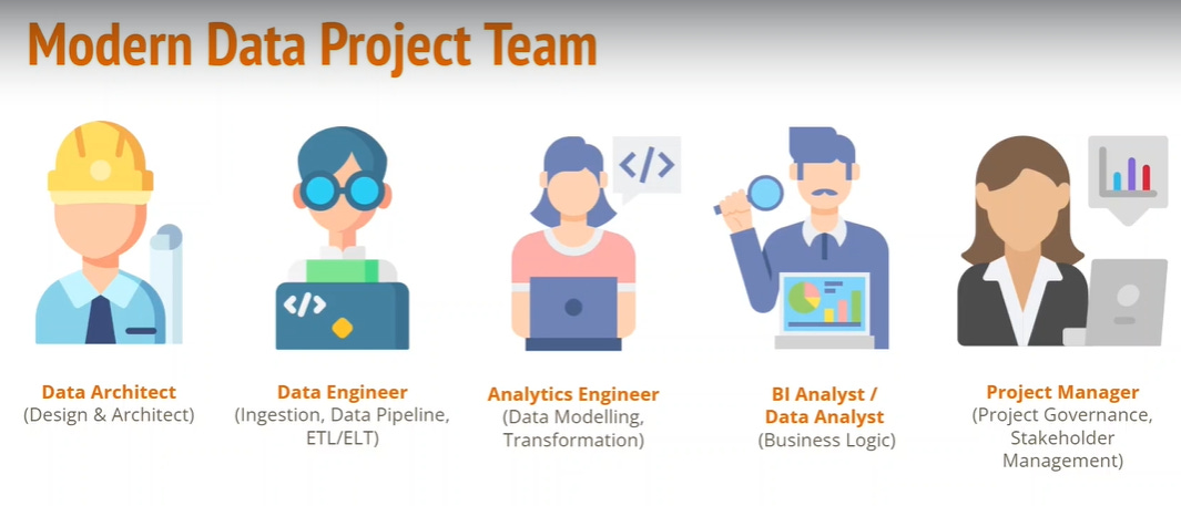 In this image, we have 4 different roles in Data Architect, Data Engineer, Analytics Engineer, and BI Analyst or Bi developer, etc. However, based on the Data Maturity of the companies we can have many of these roles clubbed into 1/2 roles.